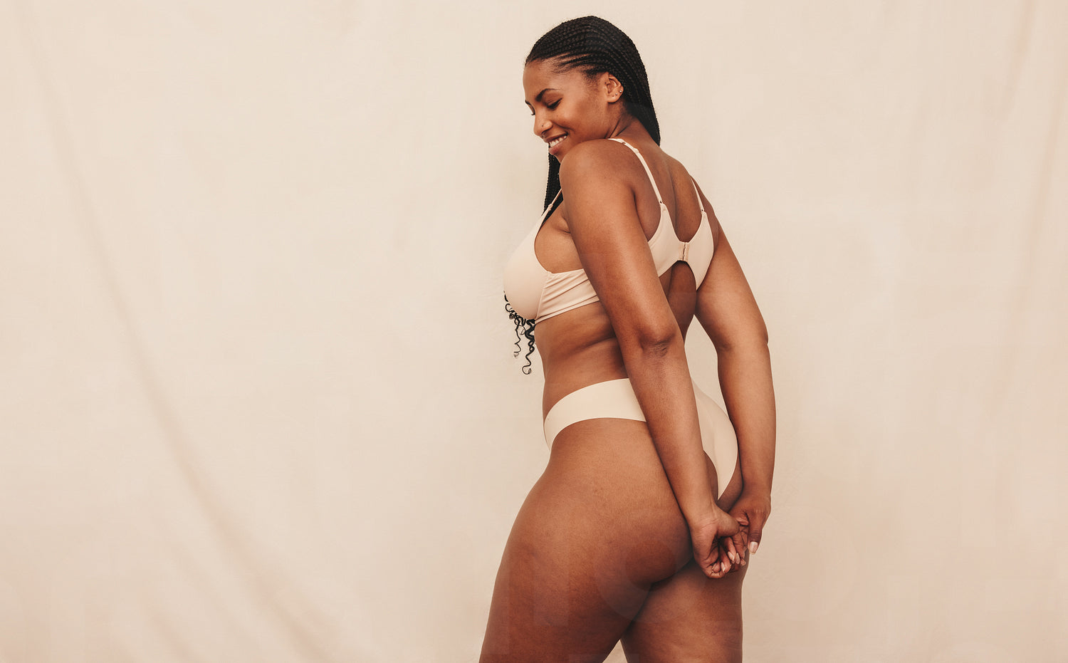 Feeling pretty in beige. Happy young woman smiling cheerfully while wearing beige underwear against a studio background. Confident young woman feeling comfortable in her own body.