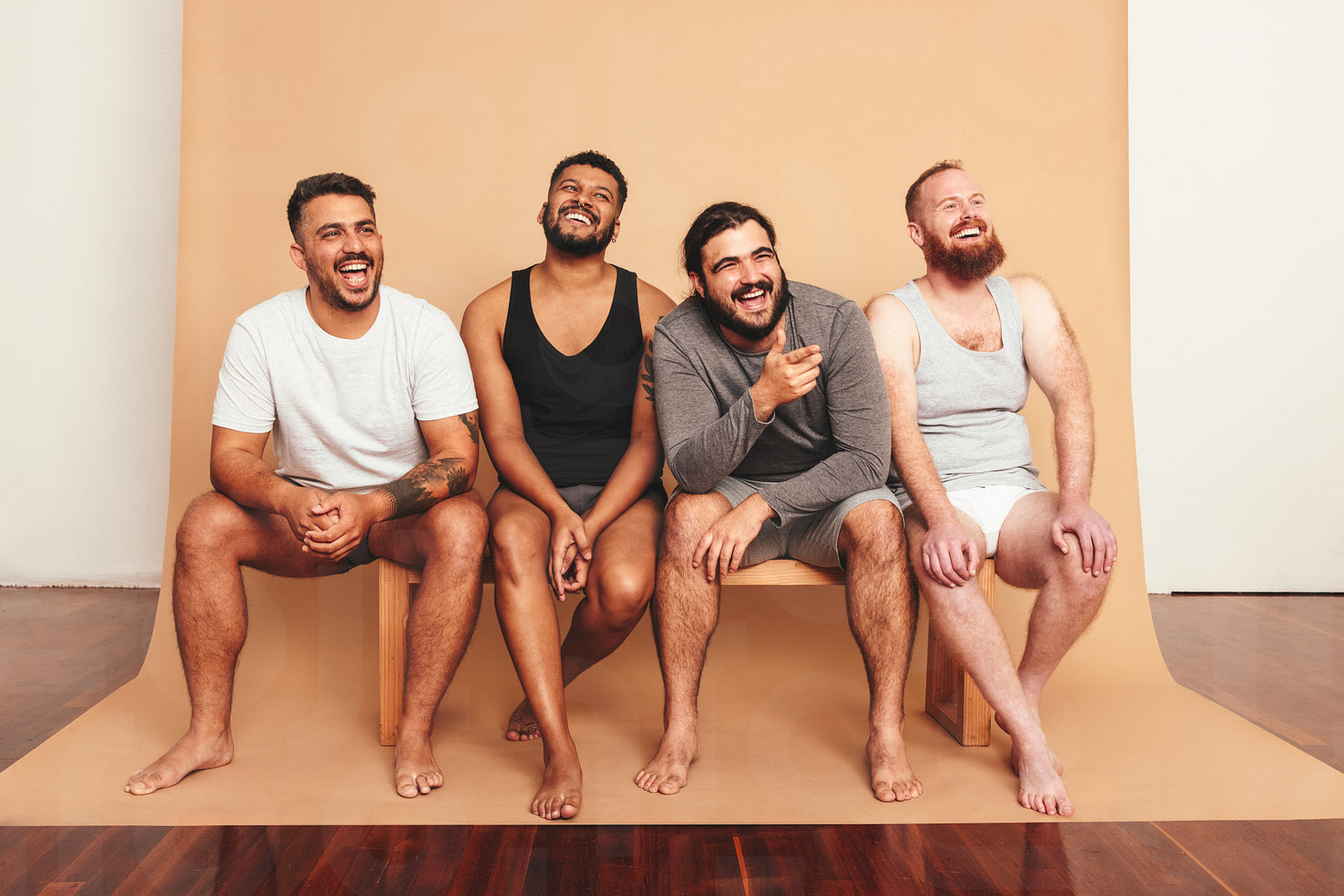 Feeling cheerful in the studio. Four body positive men laughing cheerfully while sitting on a bench. Group of self-confident young men feeling comfortable in their natural bodies.