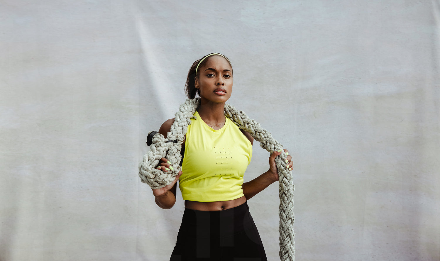 Fit African woman in exercise outfit standing with battle rope. Confident athlete woman holding battling rope.