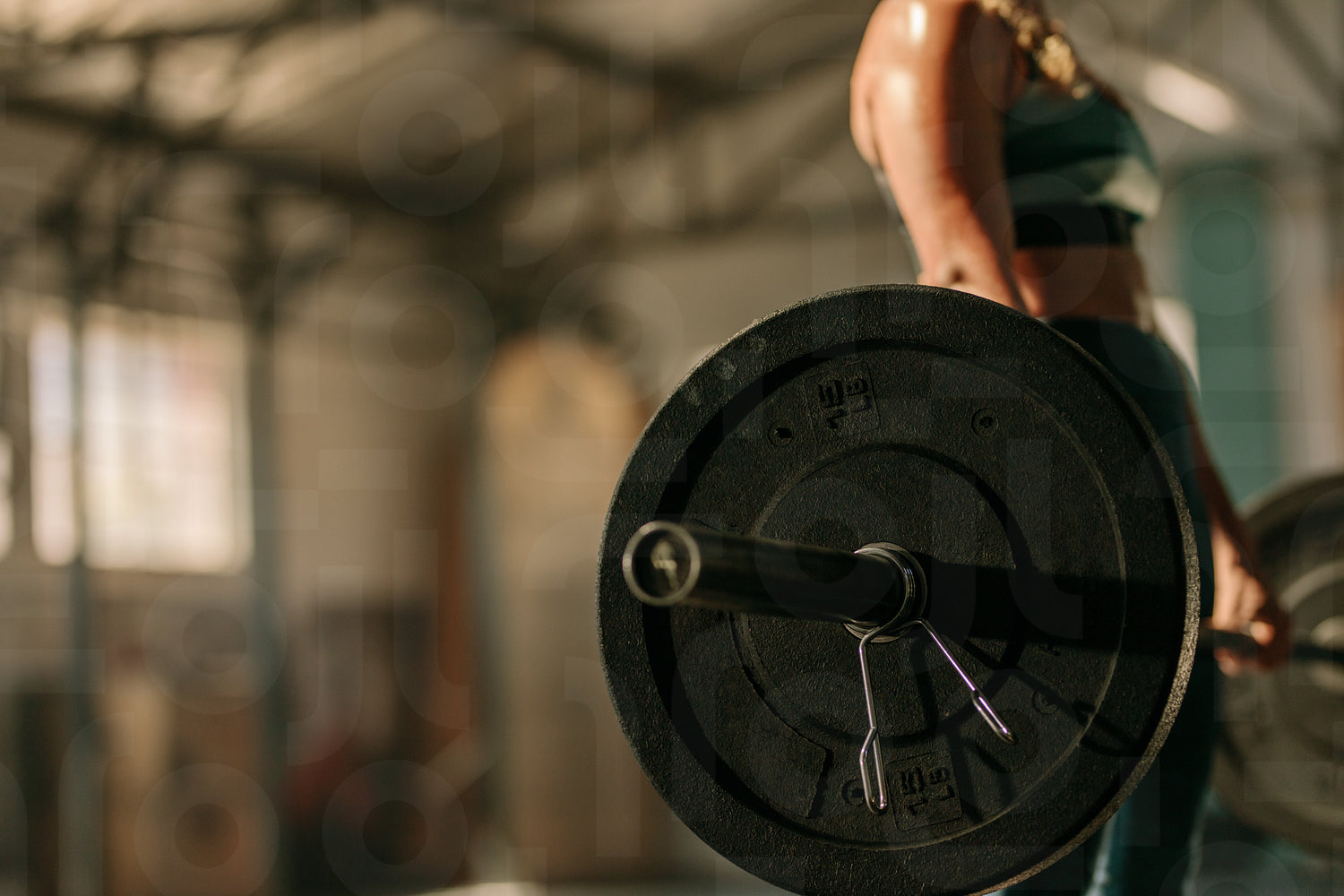 Woman exercising with heavy weights in health club. Focus on heavy weight barbell in hands of female athlete.