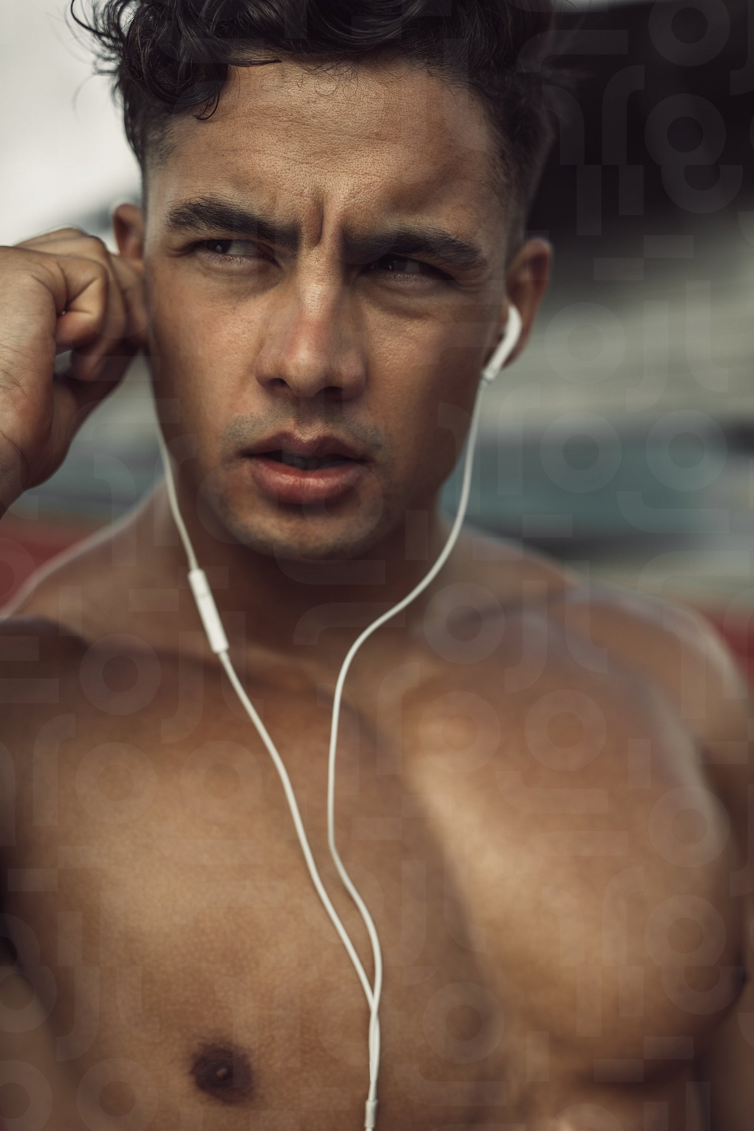 Close up of bare chested young man wearing earphone to listen music during outdoor training. Muscular male athlete on a workout outdoors.