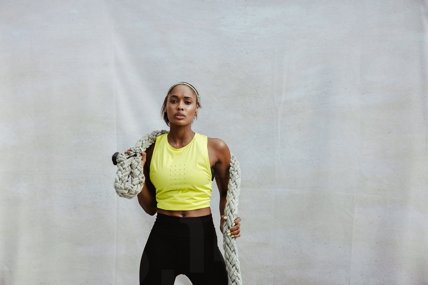 Fit woman exercising using battle rope. Female athlete in sportswear doing cross training with battle rope.