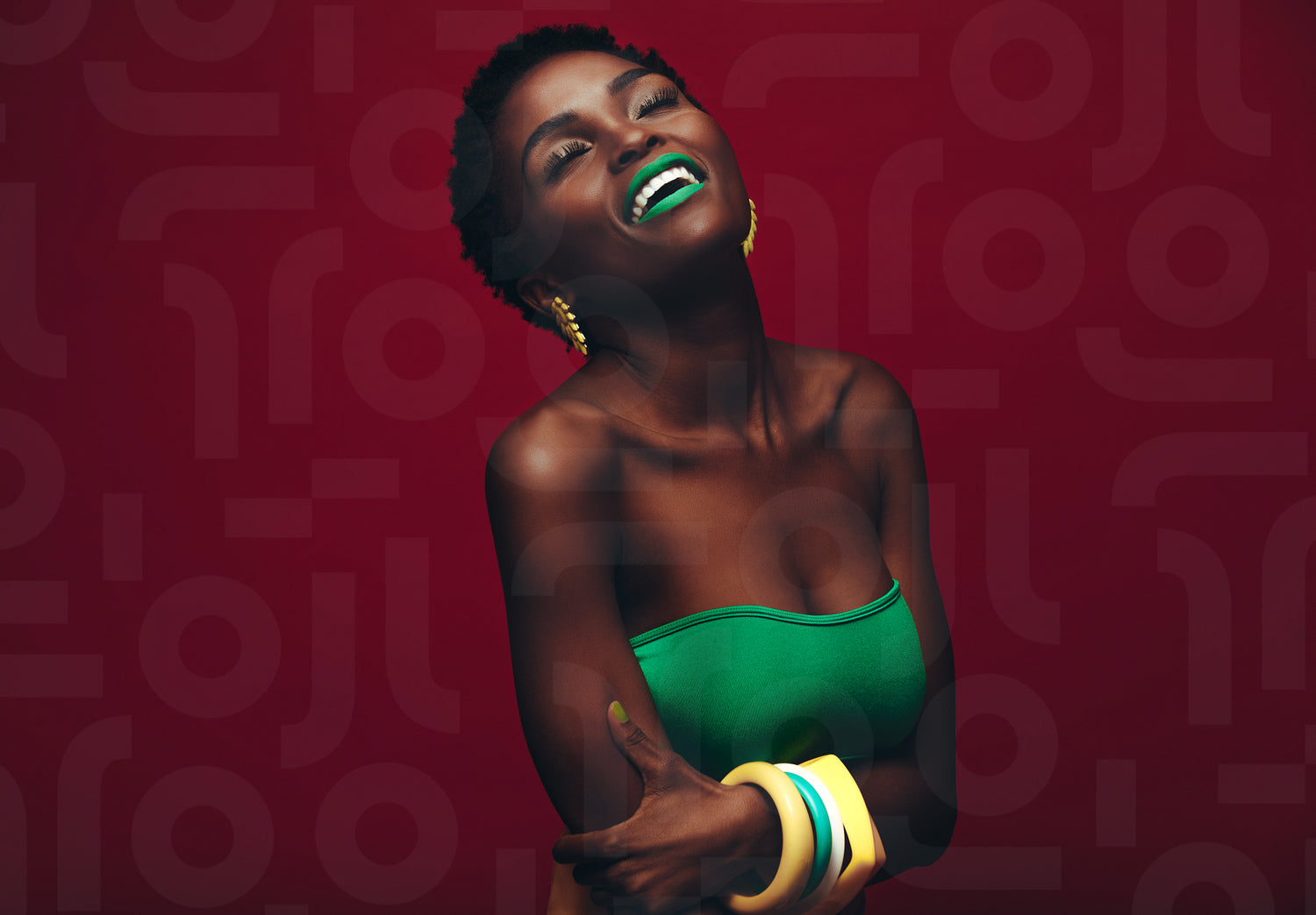 Beautiful african woman with vivid makeup. Beauty portrait of sensual model with colorful makeup on red background.