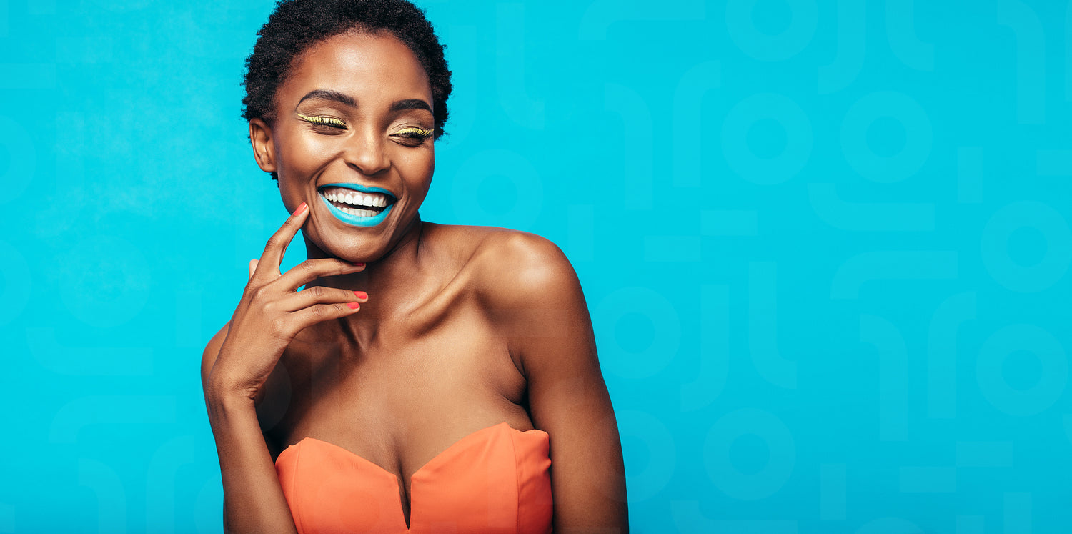 Beautiful african woman with vivid makeup smiling against blue background. Female model wearing artistic makeup looking away.