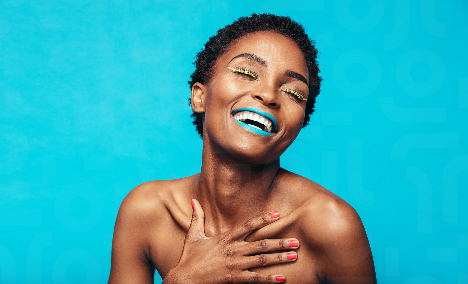 Close up of young woman with colorful makeup smiling against blue background. Beauty shot of african female model with vibrant makeup.