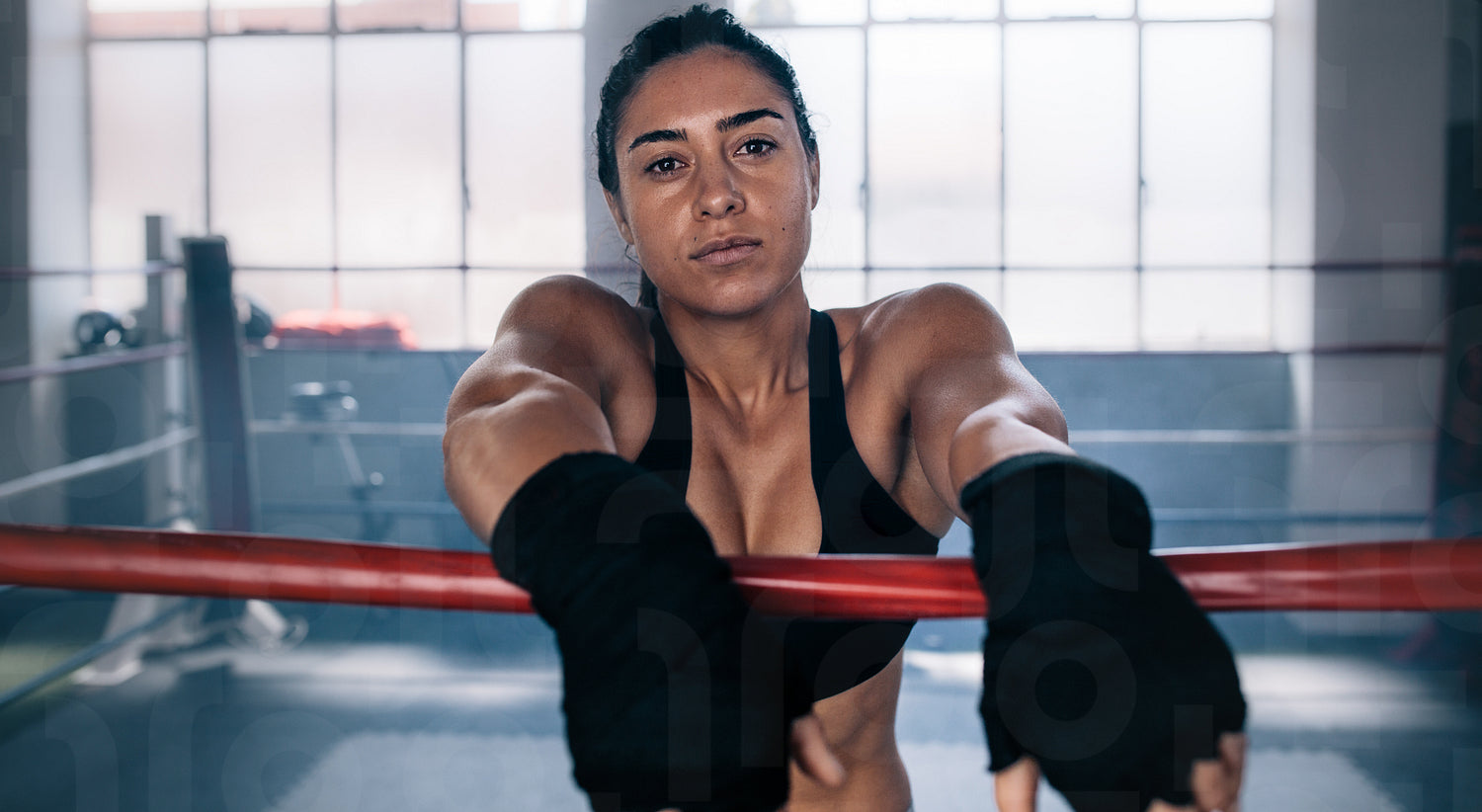 Female boxer having muscular body standing inside a boxing ring. Boxer resting her arms on the rope of boxing ring.