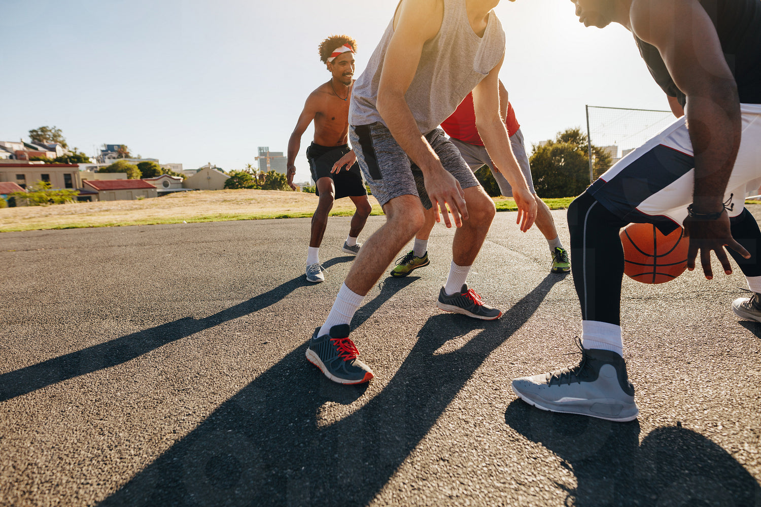 Men playing basketball game on a sunny day. Men practicing basketball skills in play area.