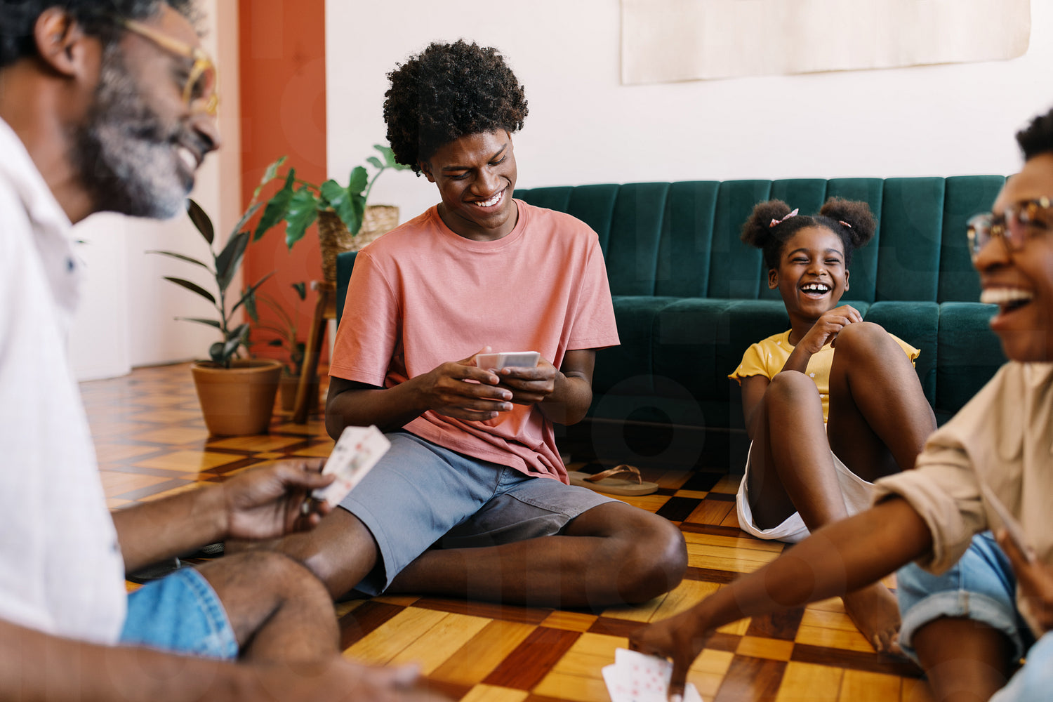 Happy black family enjoys quality time playing a card game in their home's living room. Parents and children bond, smiling and strategizing together. Fun and laughter fill the air as they create lasting memories.