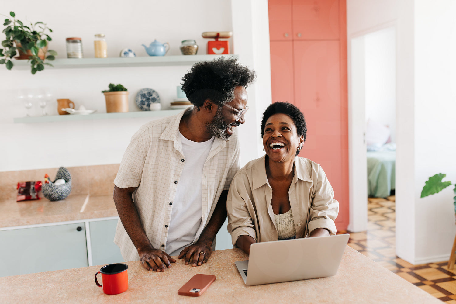 Mature husband and wife stand together in the kitchen, laughing while using a laptop. Happy black couple having fun together during their free time, enjoying technology and each other's company.