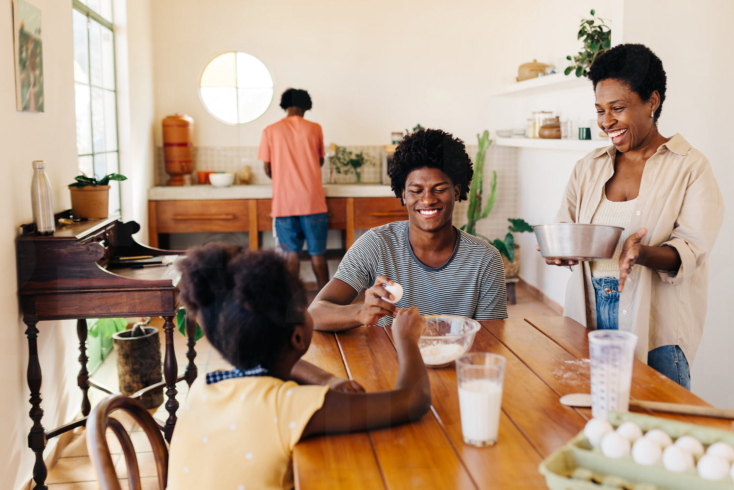 Mom baking with her children in the kitchen, making a pão de queijo recipe
