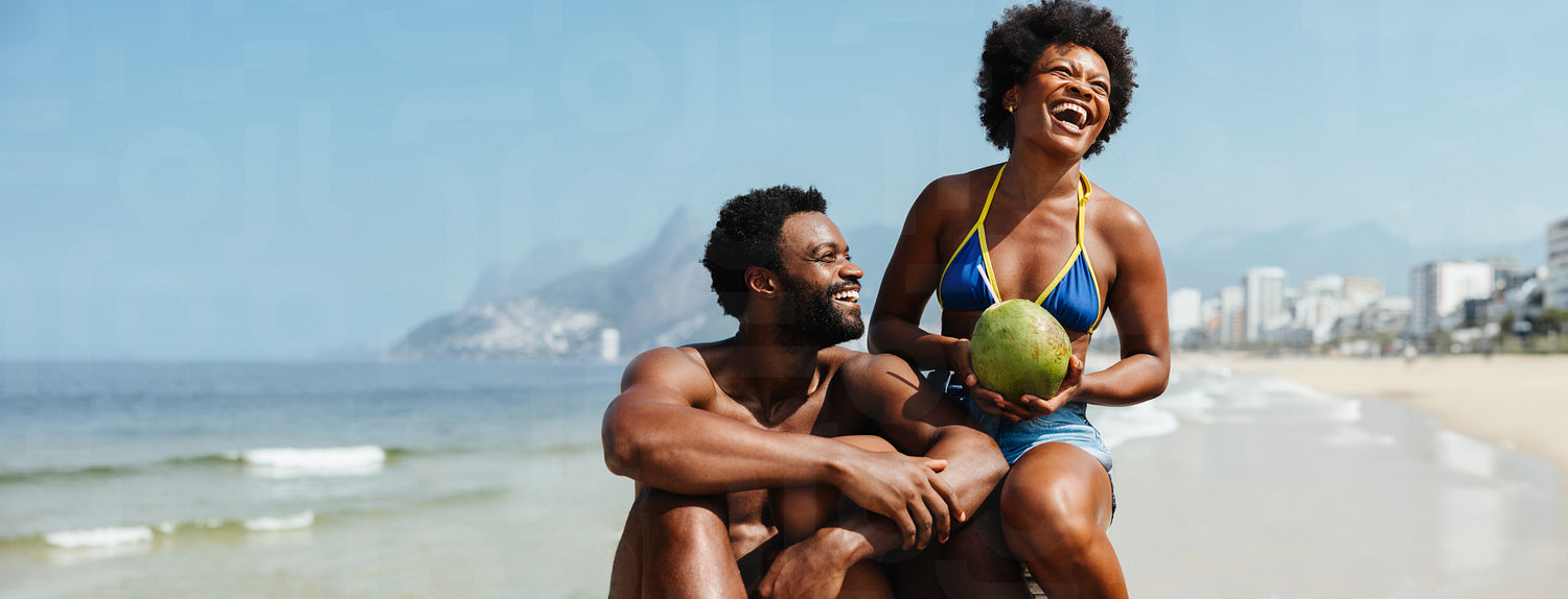 A joyful Brazilian couple is captured enjoying a summer day at the beach, showcasing vibrant energy and happiness. The woman is wearing a swimsuit and holding a coconut, while both are smiling.