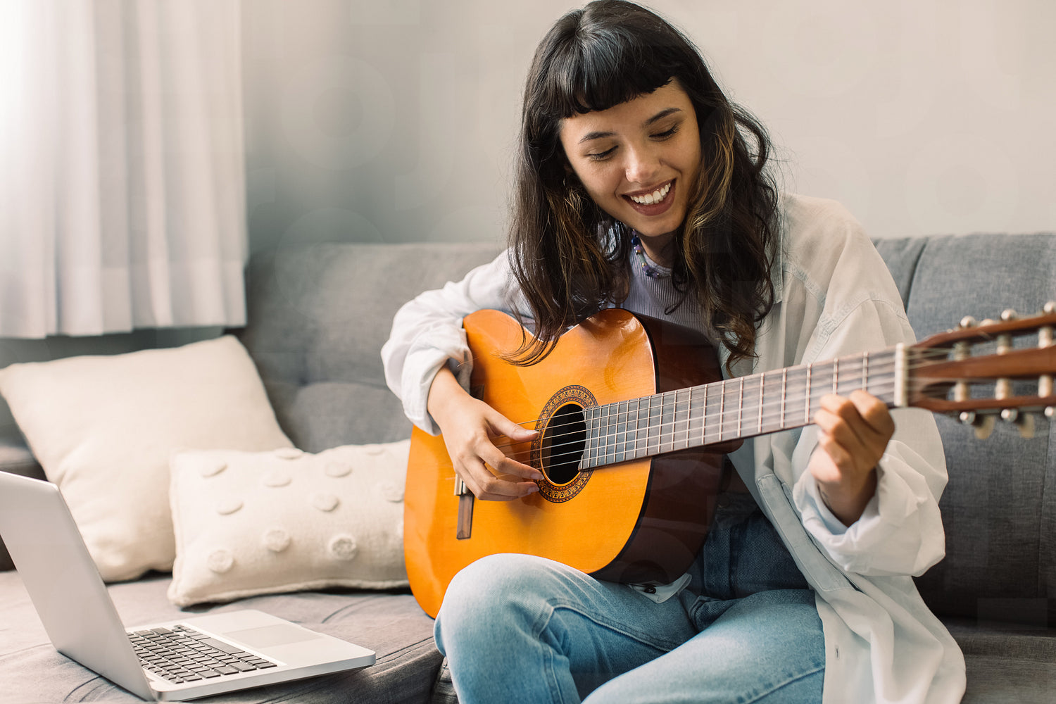 Happy female musician teaching a guitar lesson on her laptop. Young female guitarist giving an online music lesson on a video call. Woman teaching music at home during quarantine.