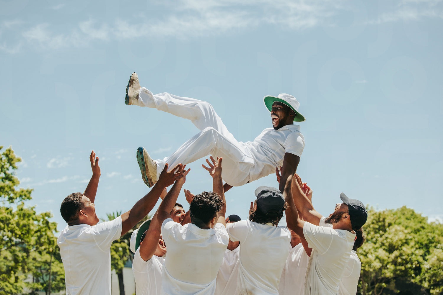 Cricket team celebrates by lifting a joyful player during a sunny match