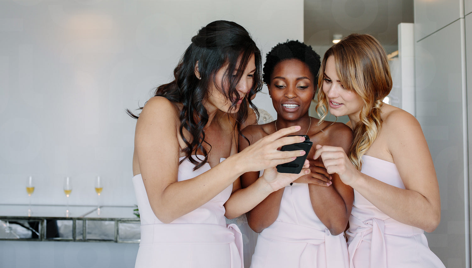 Beautiful bridesmaids on the wedding day looking at mobile phone