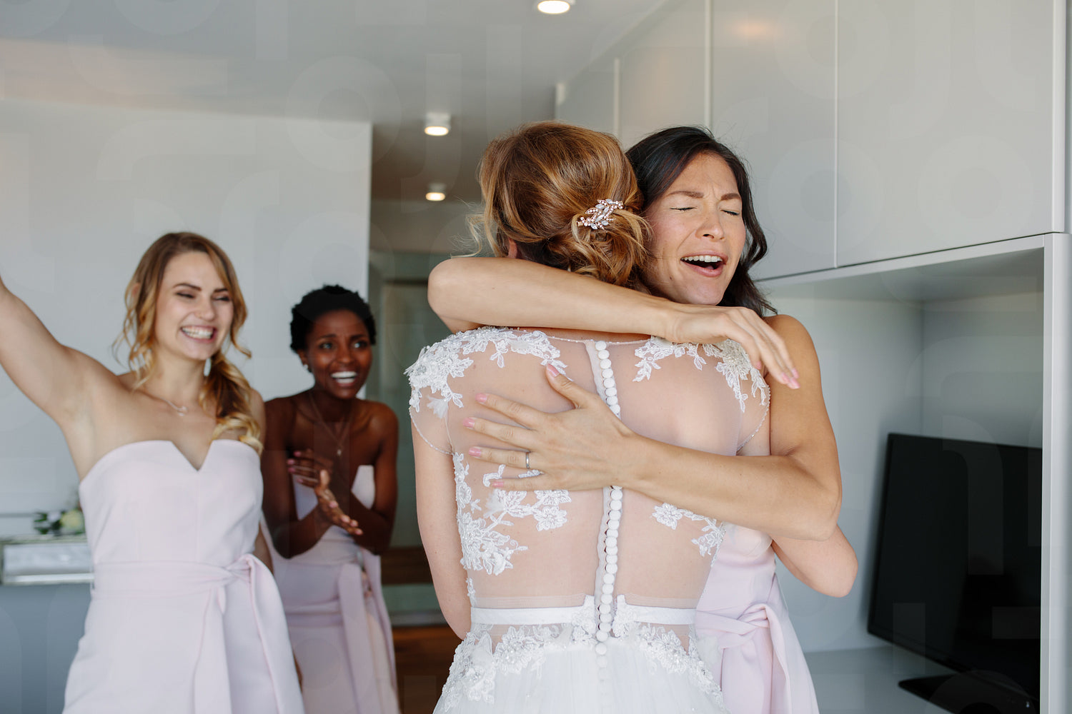 Happy bridesmaids congratulating bride in wedding gown in hotel room. Bridesmaids hugging the bride and smiling.