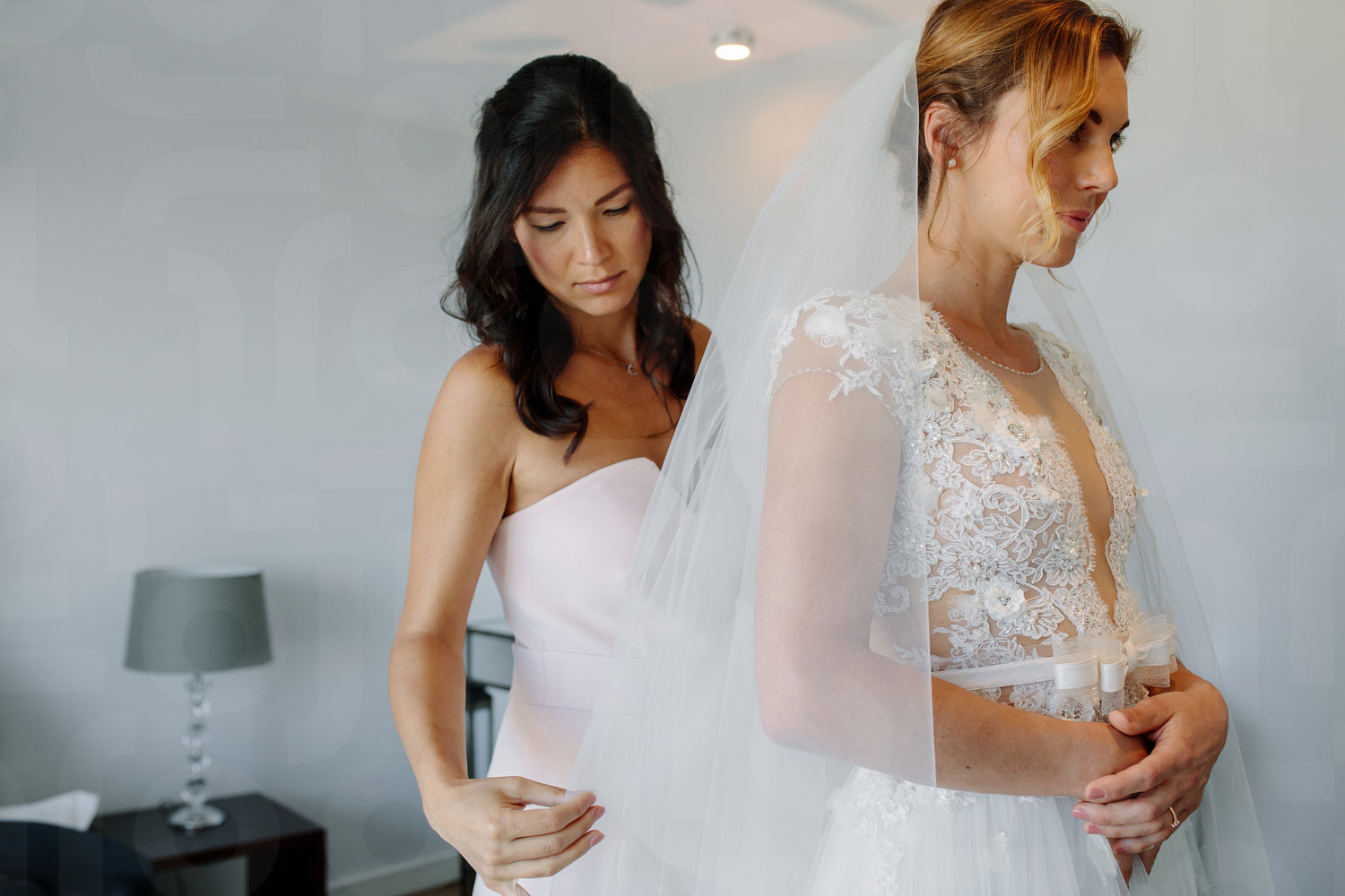Bridesmaid helping bride to put on a veil. Beautiful bride and bridesmaids during the wedding preparations.