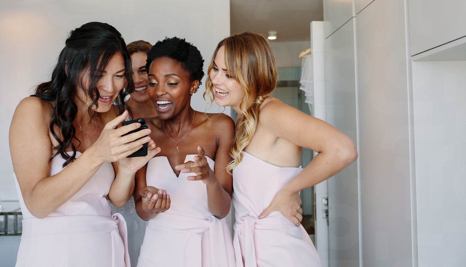 Smiling bridesmaids looking at the photographs of bride on mobile phone in a hotel room on wedding day. Beautiful bride and bridesmaid on the wedding day
