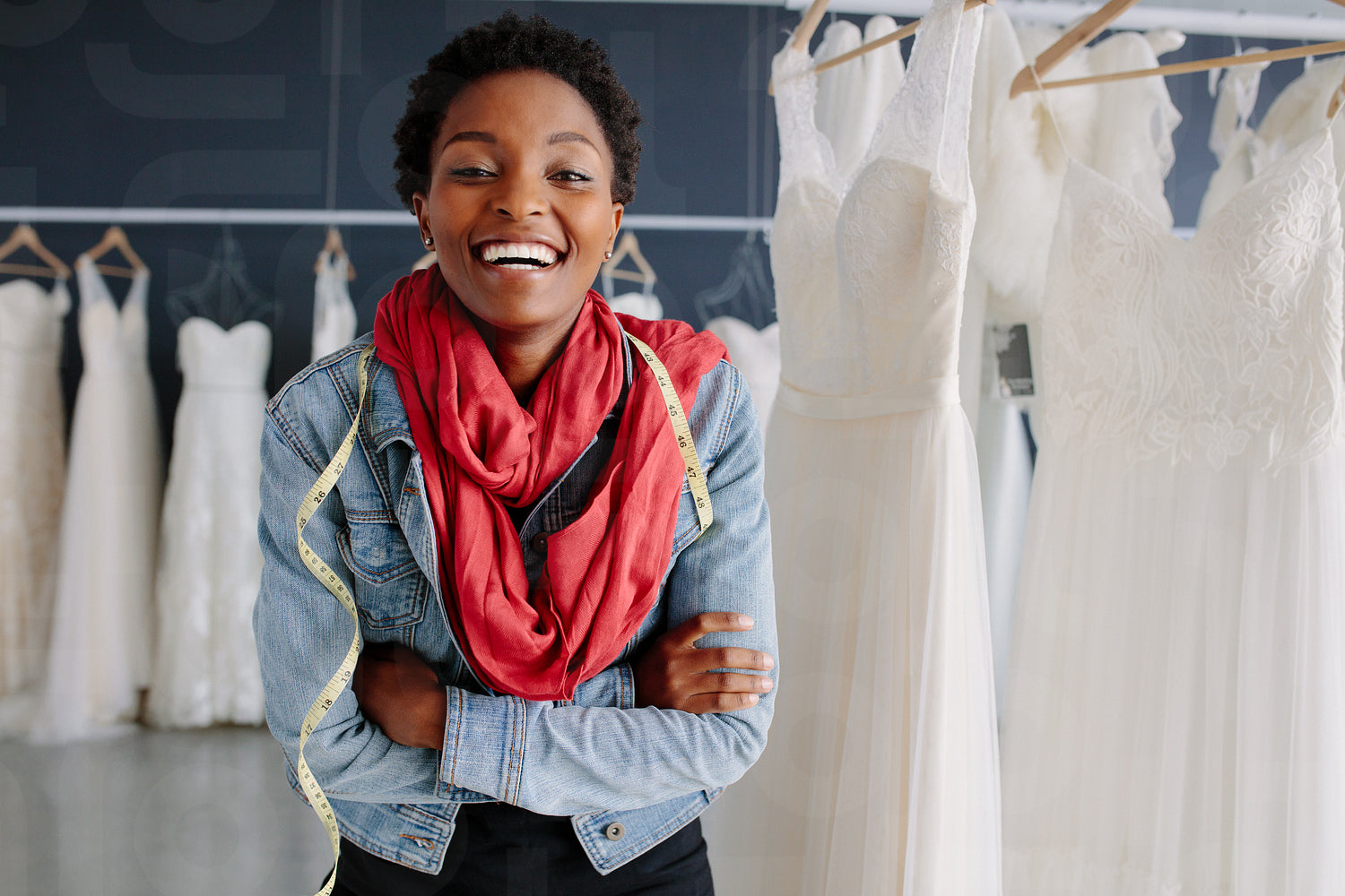 Portrait of african female bridal store owner standing with her arms crossed and smiling. Woman tailor standing in wedding fashion shop.