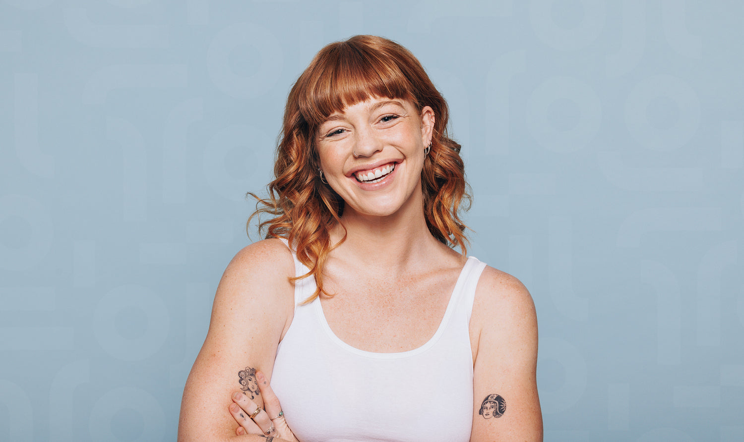 Happy red haired woman smiling at the camera in a studio. Portrait of a young caucasian woman standing in a white tank top.