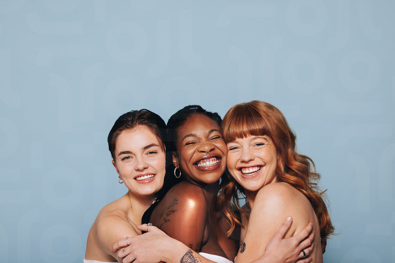 Three happy women with different skin tones smiling and embracing each other in a studio. Group of diverse women feeling comfortable in their natural skin. Body positive young women standing together.