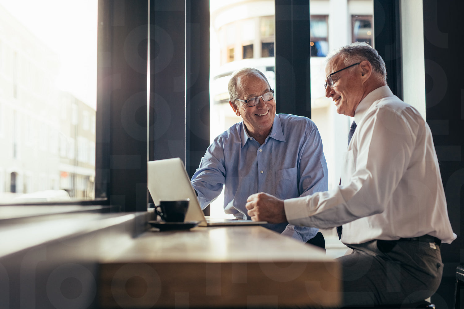 Two senior business men working together in modern cafe. Business partners sitting near window with laptop on table at restaurant.