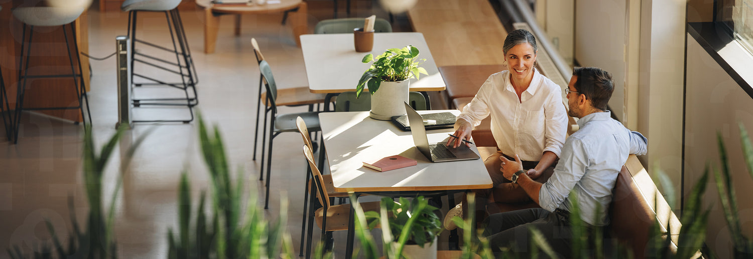 Businesswoman with laptop explaining project details to colleague at office desk. Business partners having meeting in coworking office space.