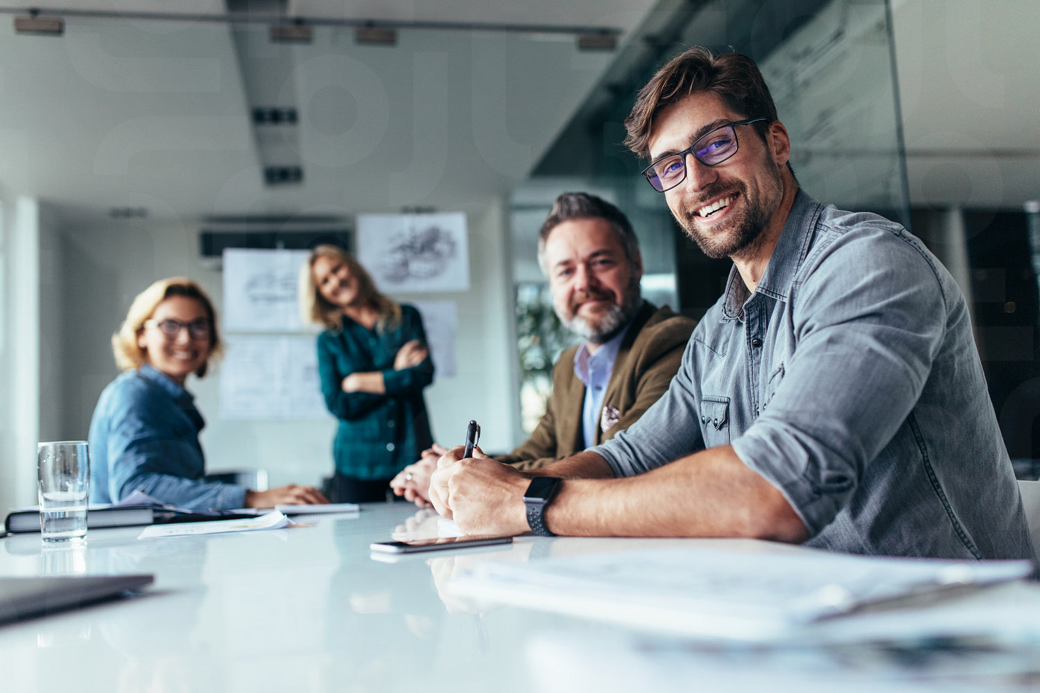 Happy group of businesspeople during presentation. Colleagues looking at camera and smiling.