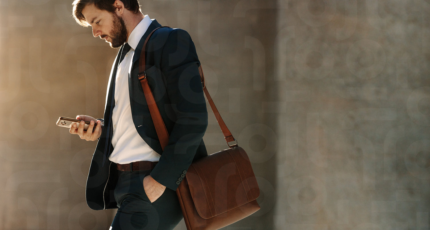 Businessman looking at his mobile phone while walking on street to office. Busy office going man commuting to office carrying his office bag and using mobile phone.