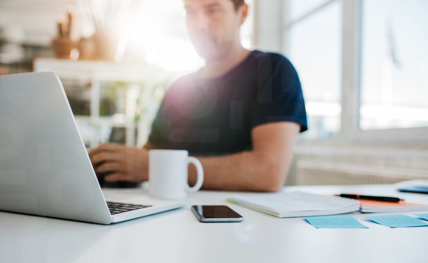 Shot of business man sitting at his desk with laptop, mobile phone and cup of coffee. Focus on smart phone.