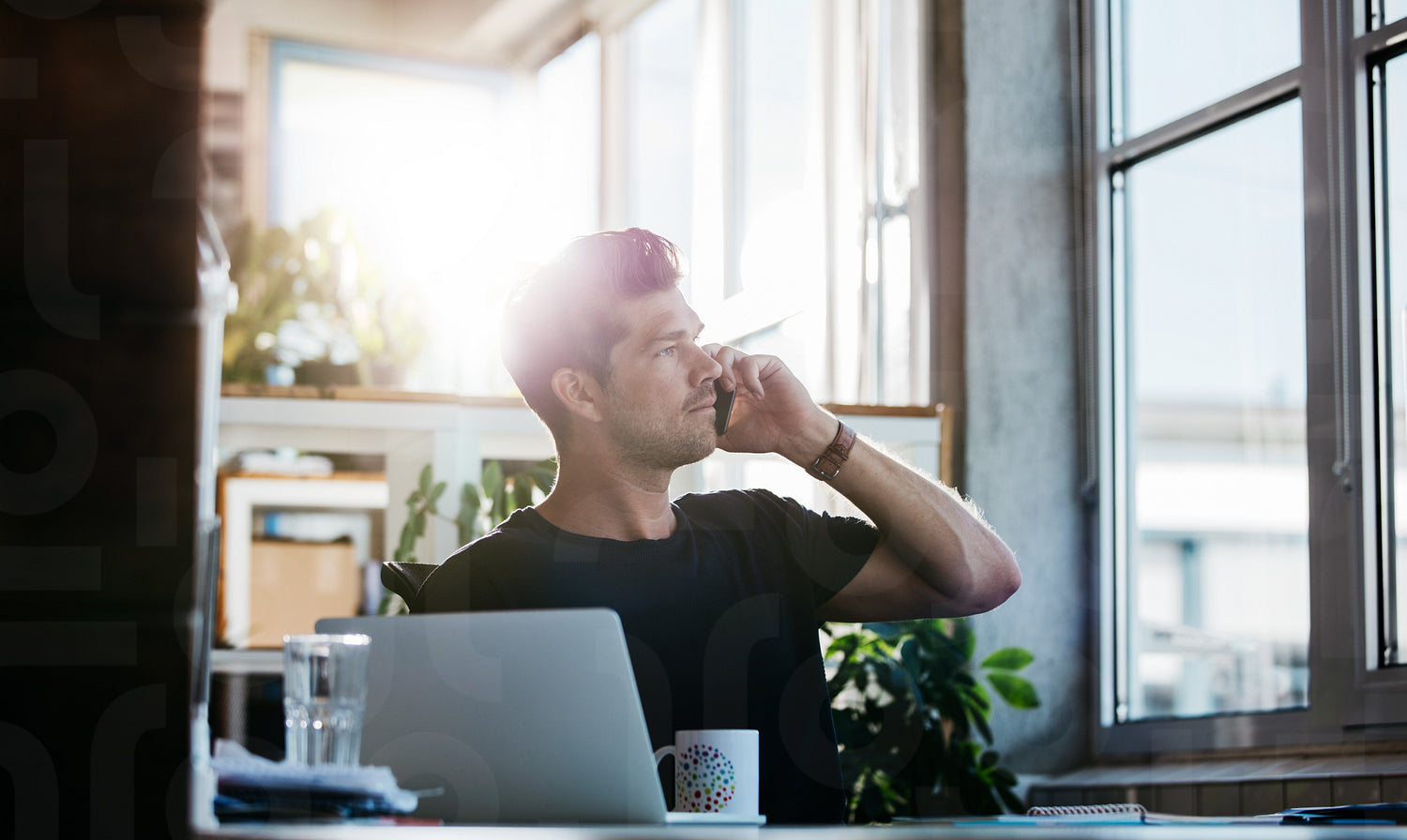 Shot of young man sitting at his office talking on cell phone. Business man working at his desk with laptop making a phone call.