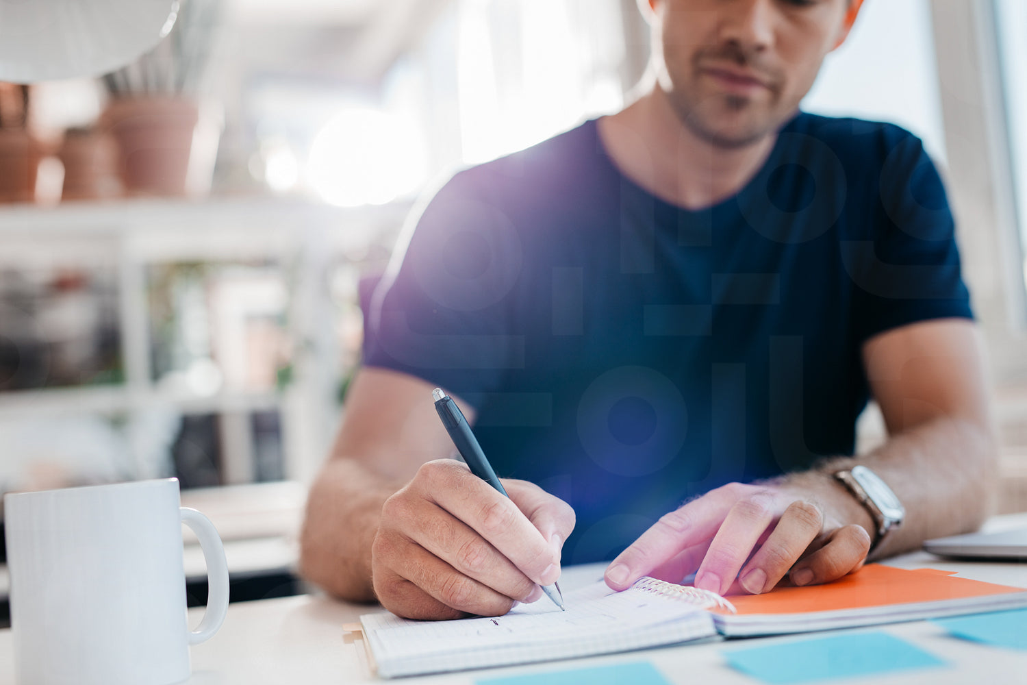 Young businessman writing down important notes in diary at his desk. Young businessman writing in his notepad.