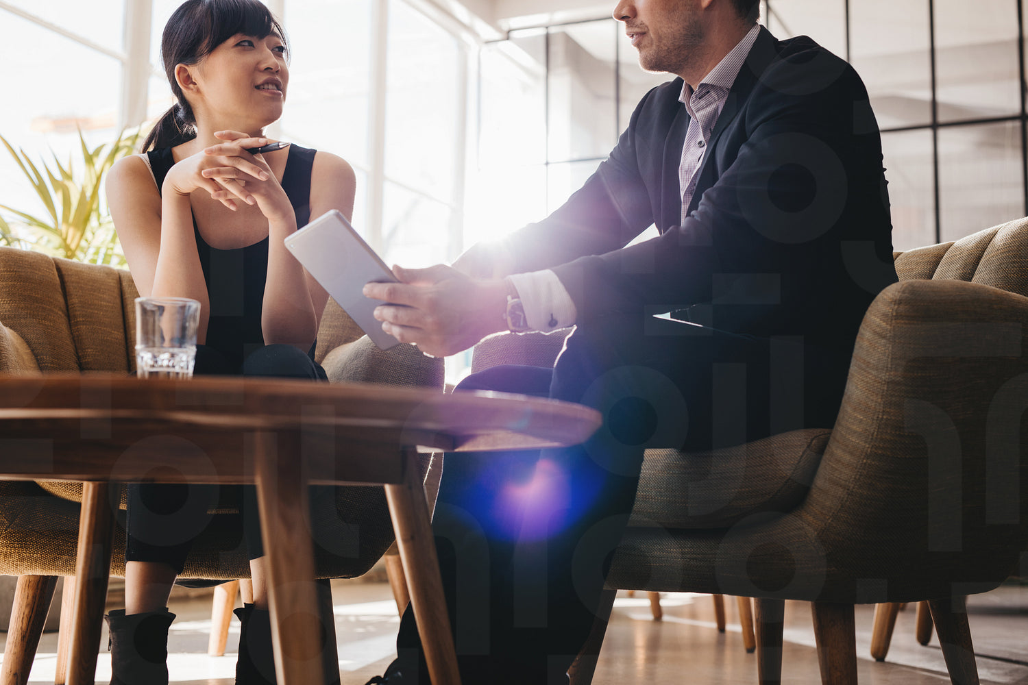 Shot of business man showing something on digital tablet to his female colleague. Business people meeting in office lobby.