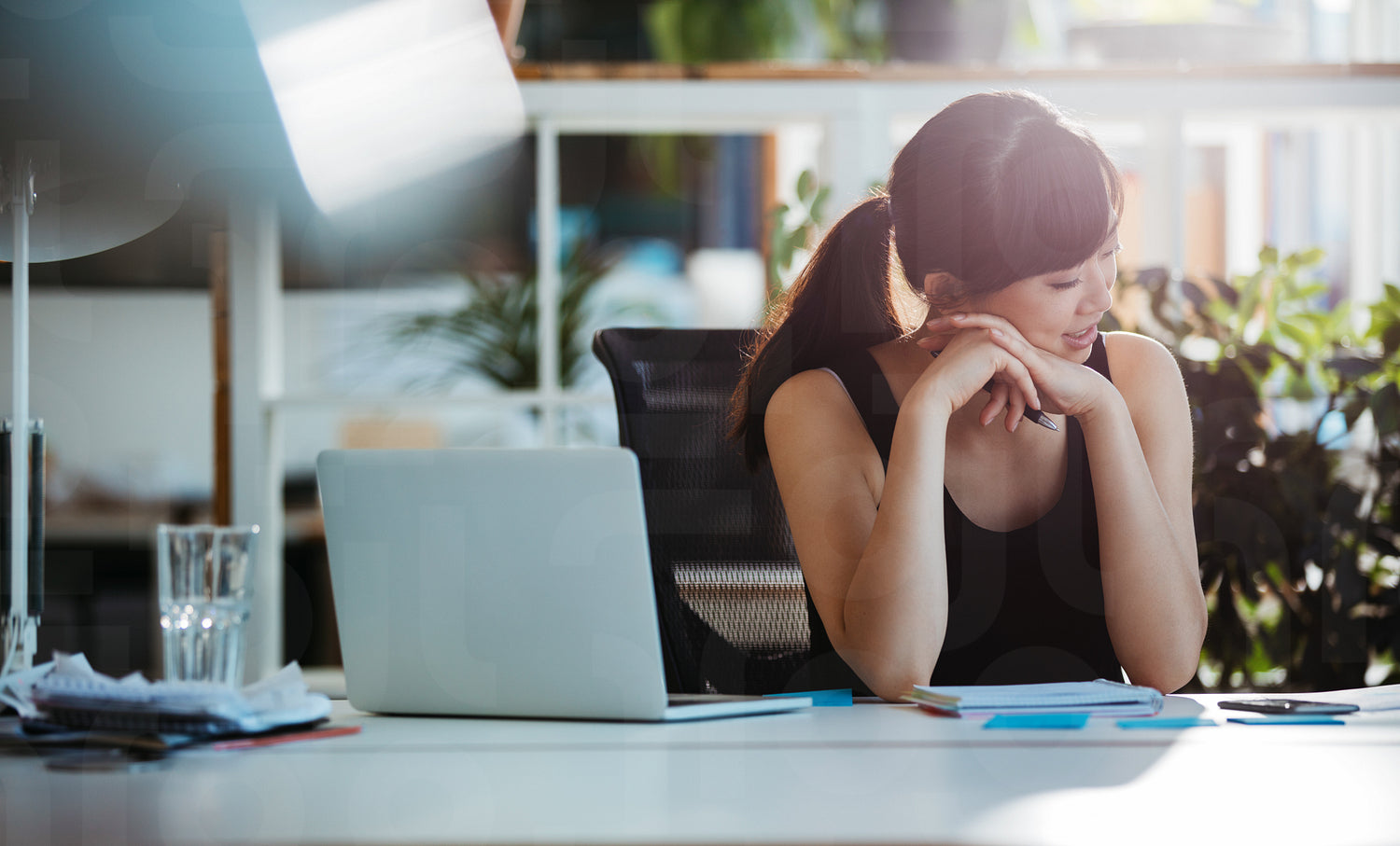 Shot of young woman sitting at her desk with laptop looking at documents. Asian business woman going through paperwork in office.