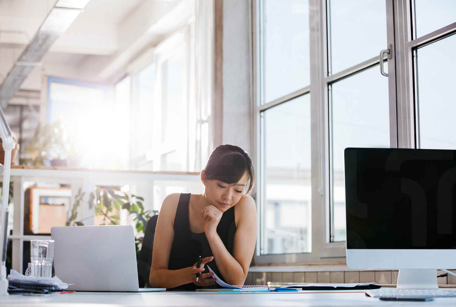 Shot of beautiful young woman sitting at her work desk going through some documents. Asian businesswoman working in modern office.