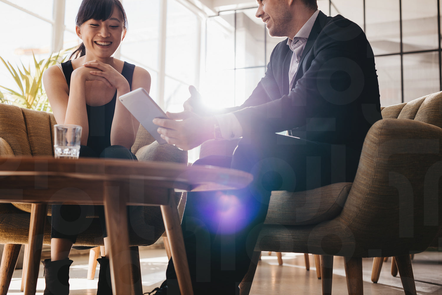 Two corporate colleagues discussing business ideas using digital tablet. Young businessman having meeting with female partner in office lobby