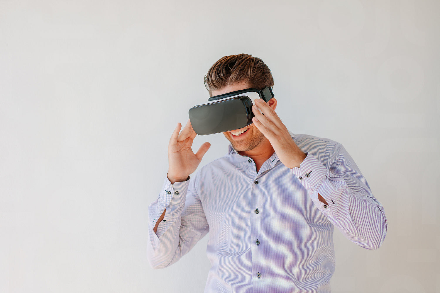 Shot of happy businessman watches content on a virtual reality display. Businessman with virtual reality goggles against grey background.