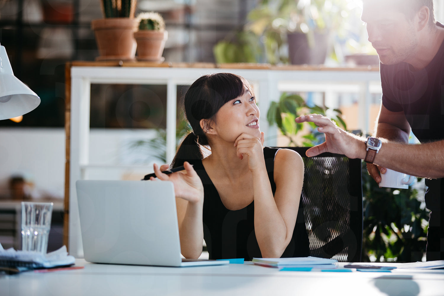 Smiling businesswoman talking with partner while sitting at her desk. Professional employees discussing ideas of project on laptop.