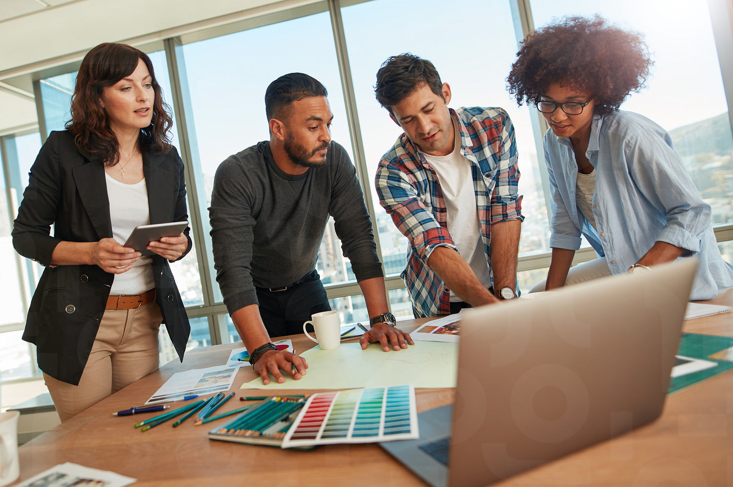 Creative business team discussing while working together new project in office. Young man and woman standing around the table and discussing new ideas.