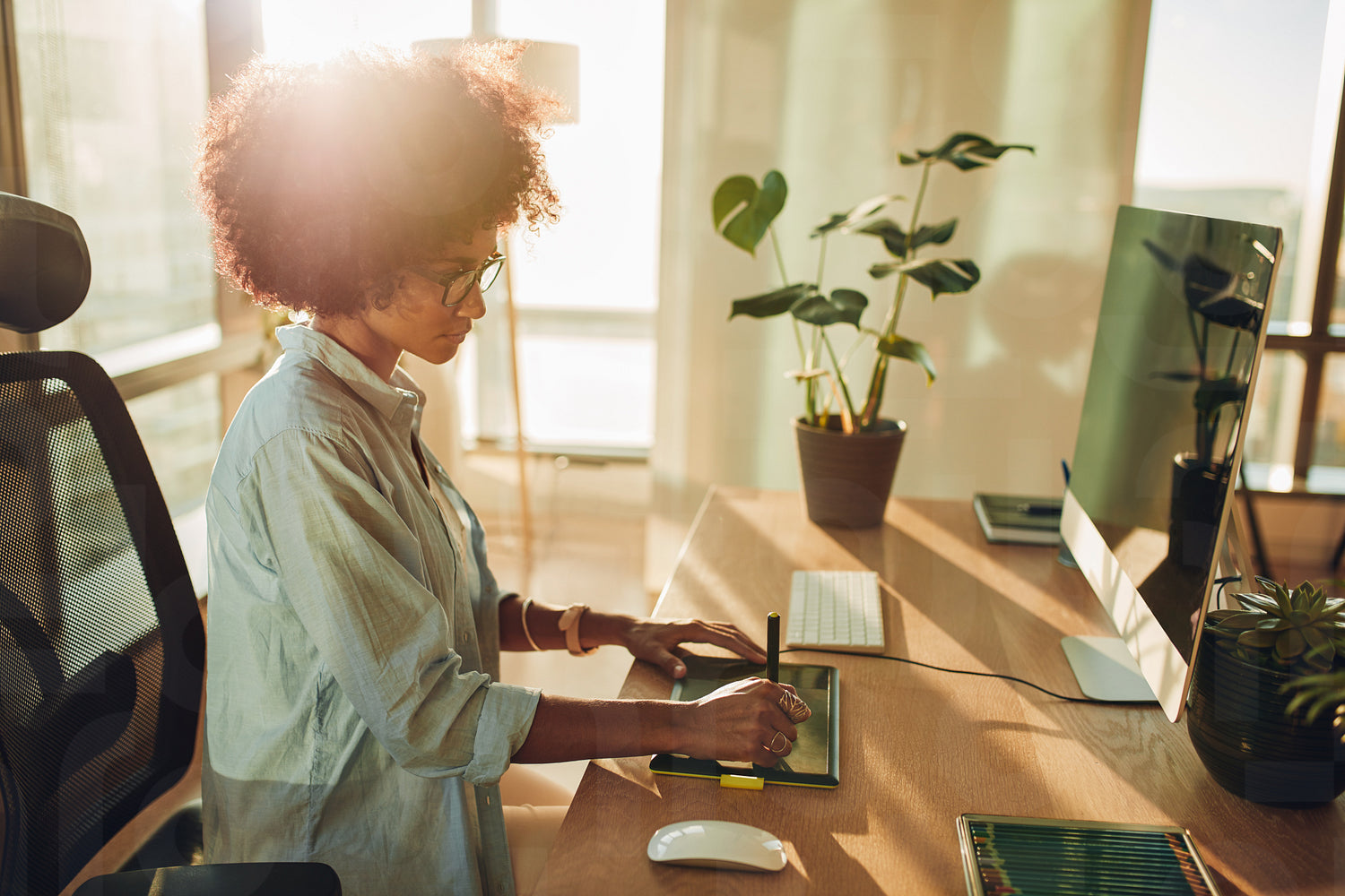 Young hipster graphic designer woman using digital graphic tablet while working at modern office. Professional female retoucher sitting at modern workspace.