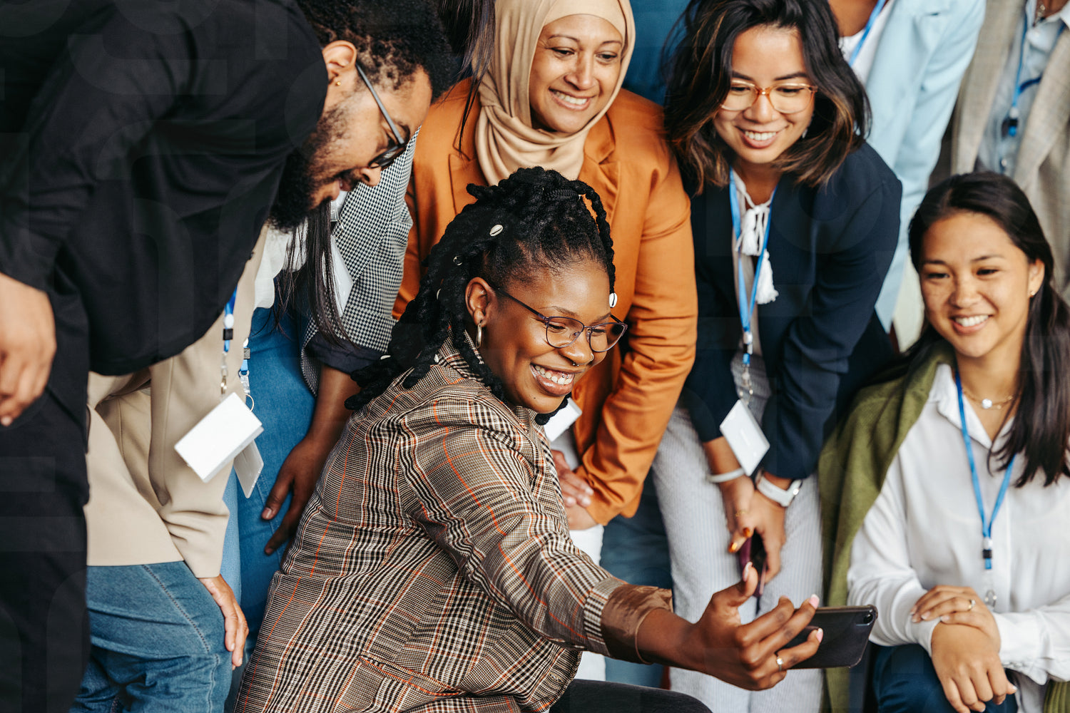 A multiethnic team is posing for a photo, showcasing their unity and camaraderie within a dynamic workplace, highlighting diversity and collaboration.