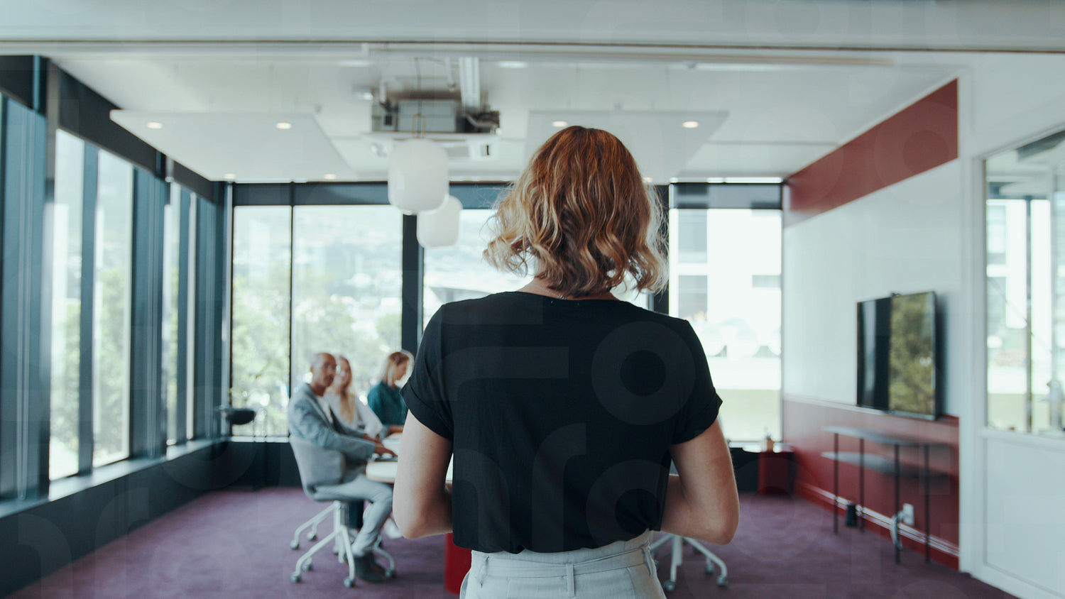 Rear view of a female entrepreneur walking to the conference table with colleagues. Entrepreneur arriving in the conference room with her team settling down around the table.