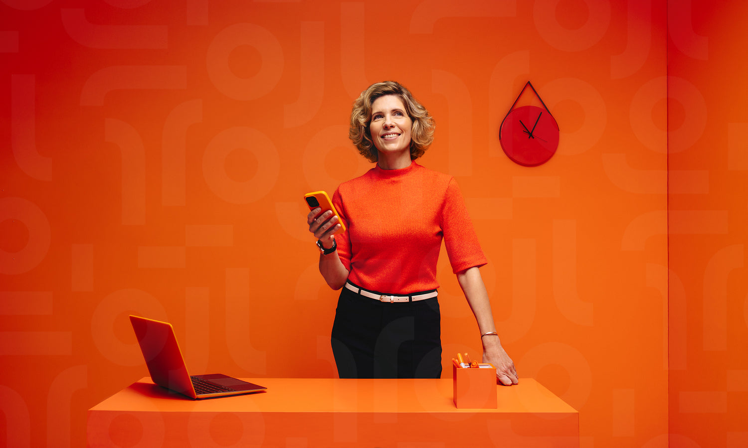 Happy woman texting on cell phone in a vibrant, monochromatic orange office set, ideal for creative workspaces and modern settings.