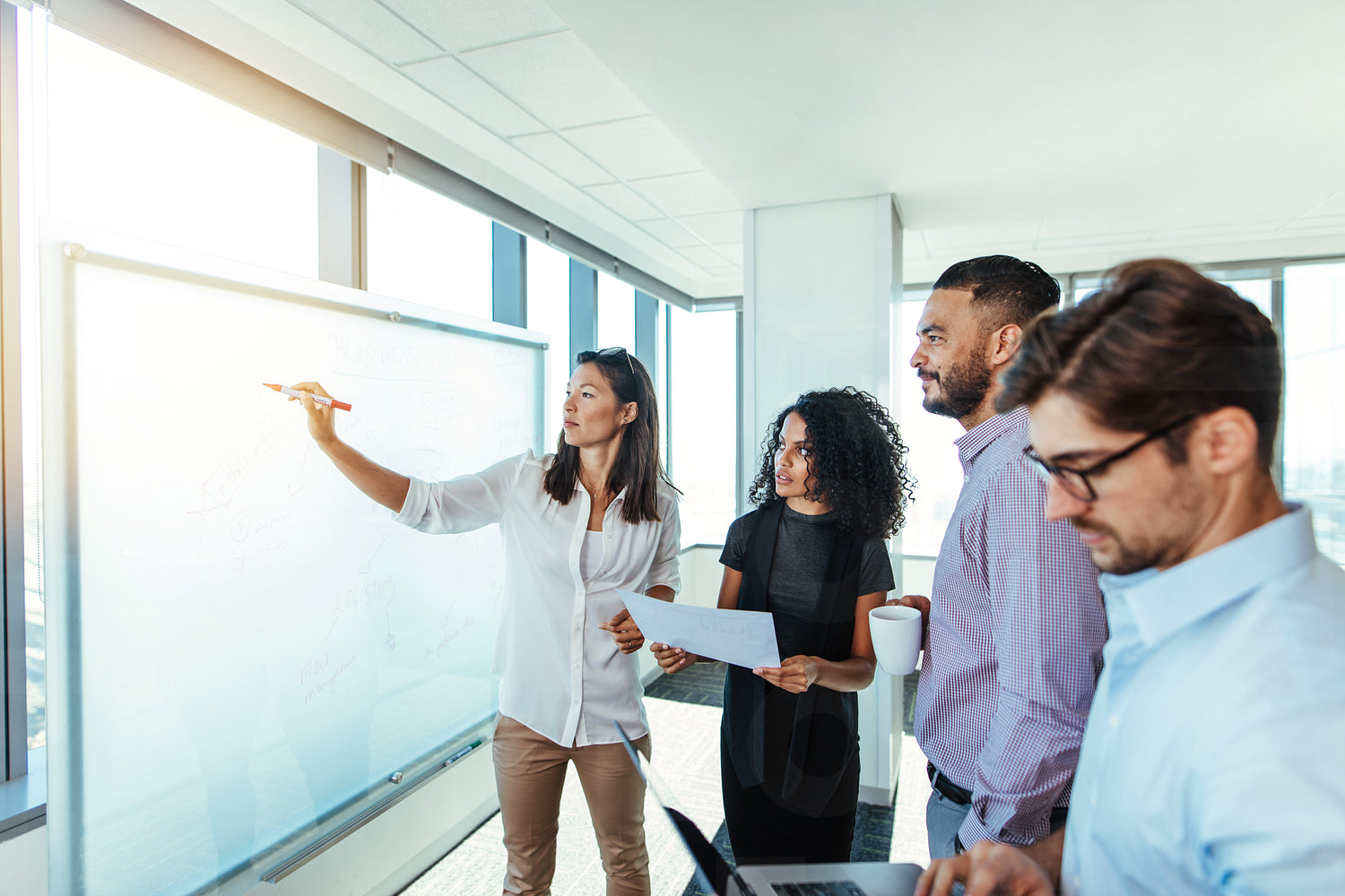Business woman making a presentation on a white board to her colleagues. Group of business associates making plans in boardroom.
