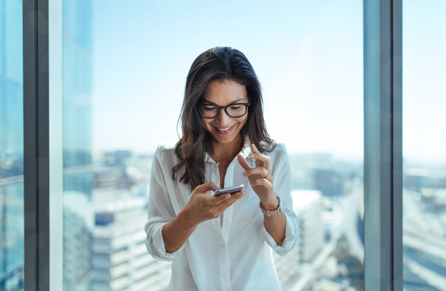 Young woman smiling and making gestures while using her mobile phone. Young woman standing in her office in a highrise building overlooking the cityscape.