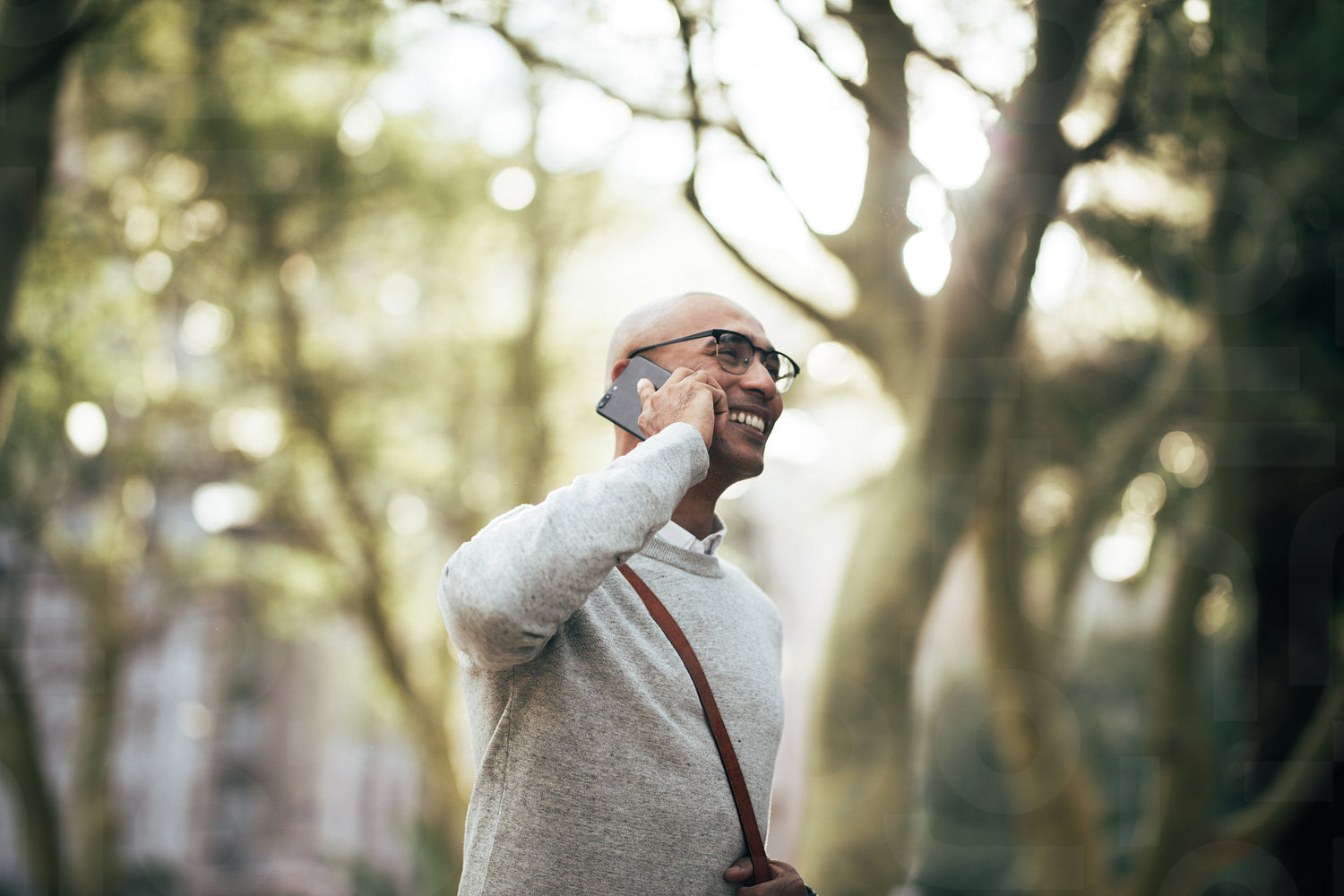 Man walking through park wearing office bag talking on mobile phone. Smiling businessman talking over cell phone while walking on city street to work.
