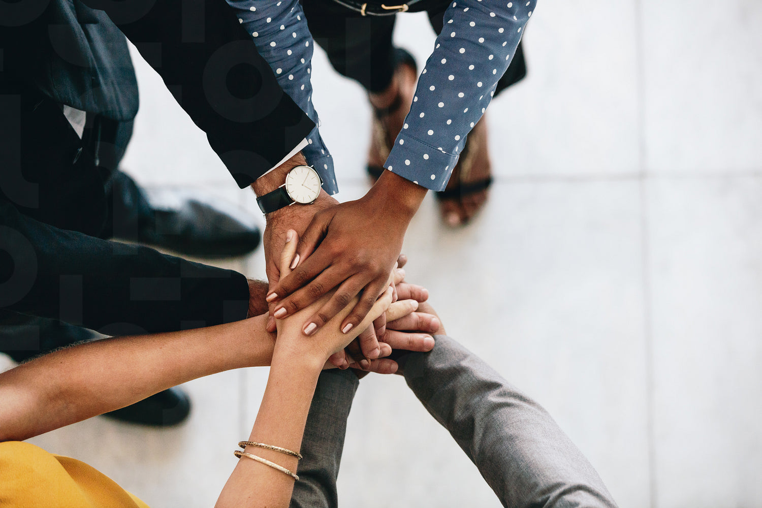 Close up of business team hands stacked together. Business colleagues showing unity.