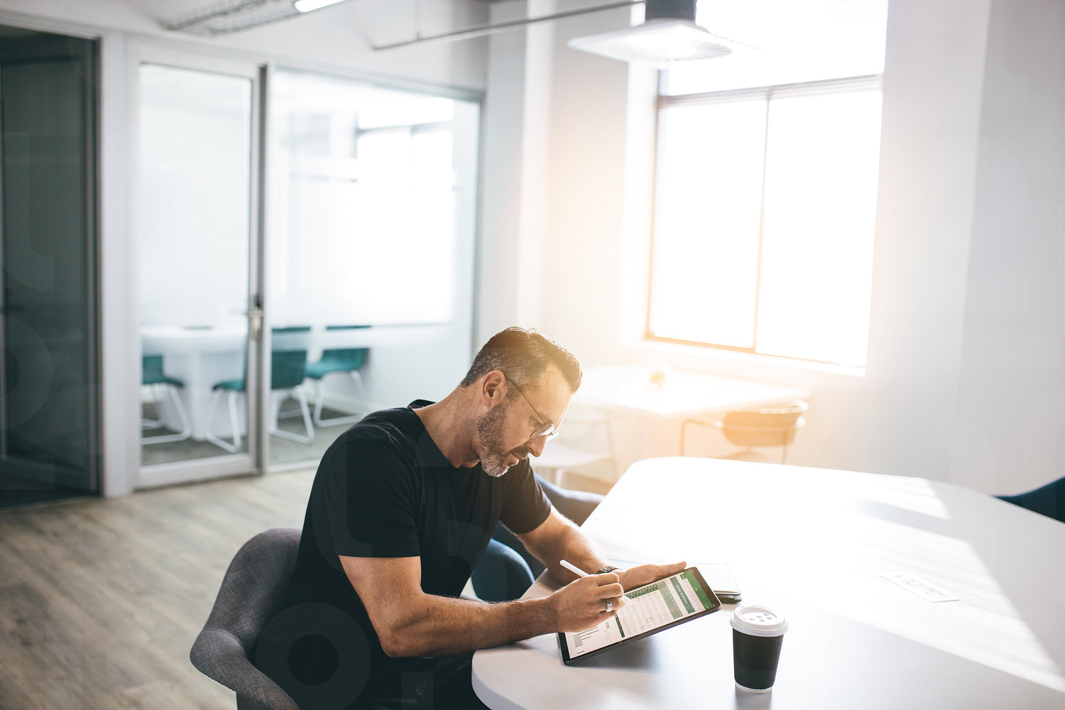 Mature businessman working on his digital tablet in a bright office. Entrepreneur checking emails on his tablet computer.