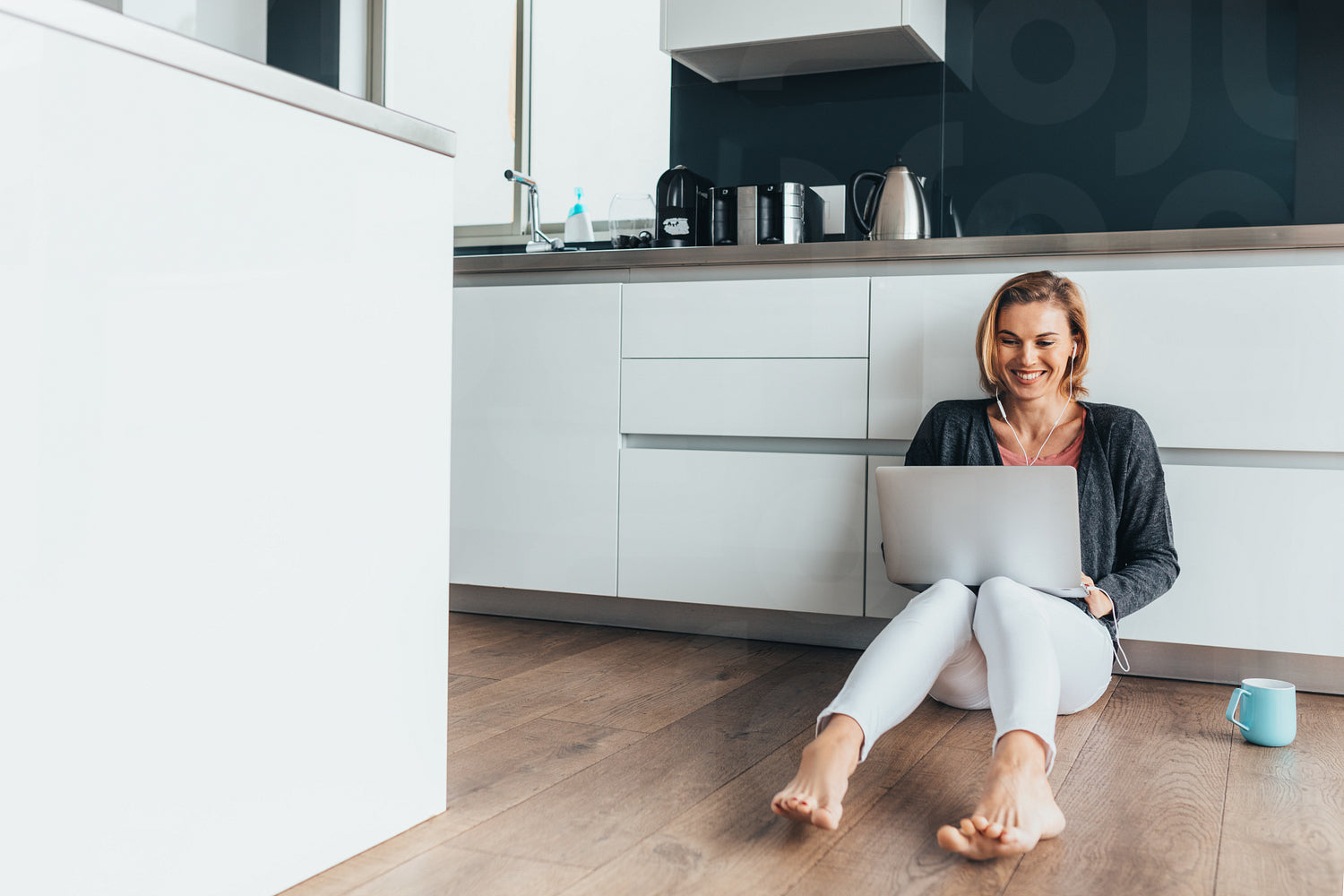 Woman video calling using a laptop computer sitting on the kitchen floor wearing earphones. Smiling woman sitting on floor with a coffee mug working on laptop computer.