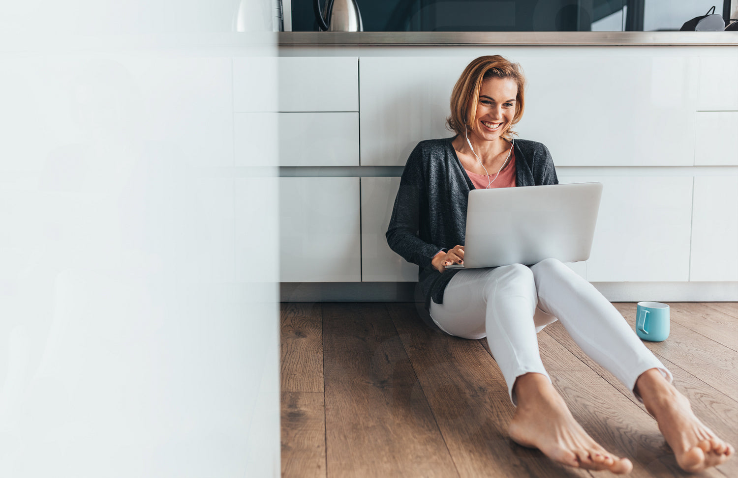 Woman video calling using a laptop computer sitting on the kitchen floor wearing earphones. Smiling woman working on laptop computer with a coffee mug by her side.