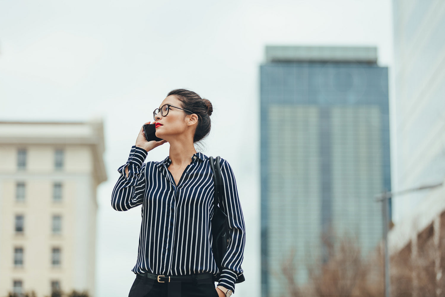 Young asian businesswoman walking outdoors and talking on cellphone. Female business professional walking outside using mobile phone.
